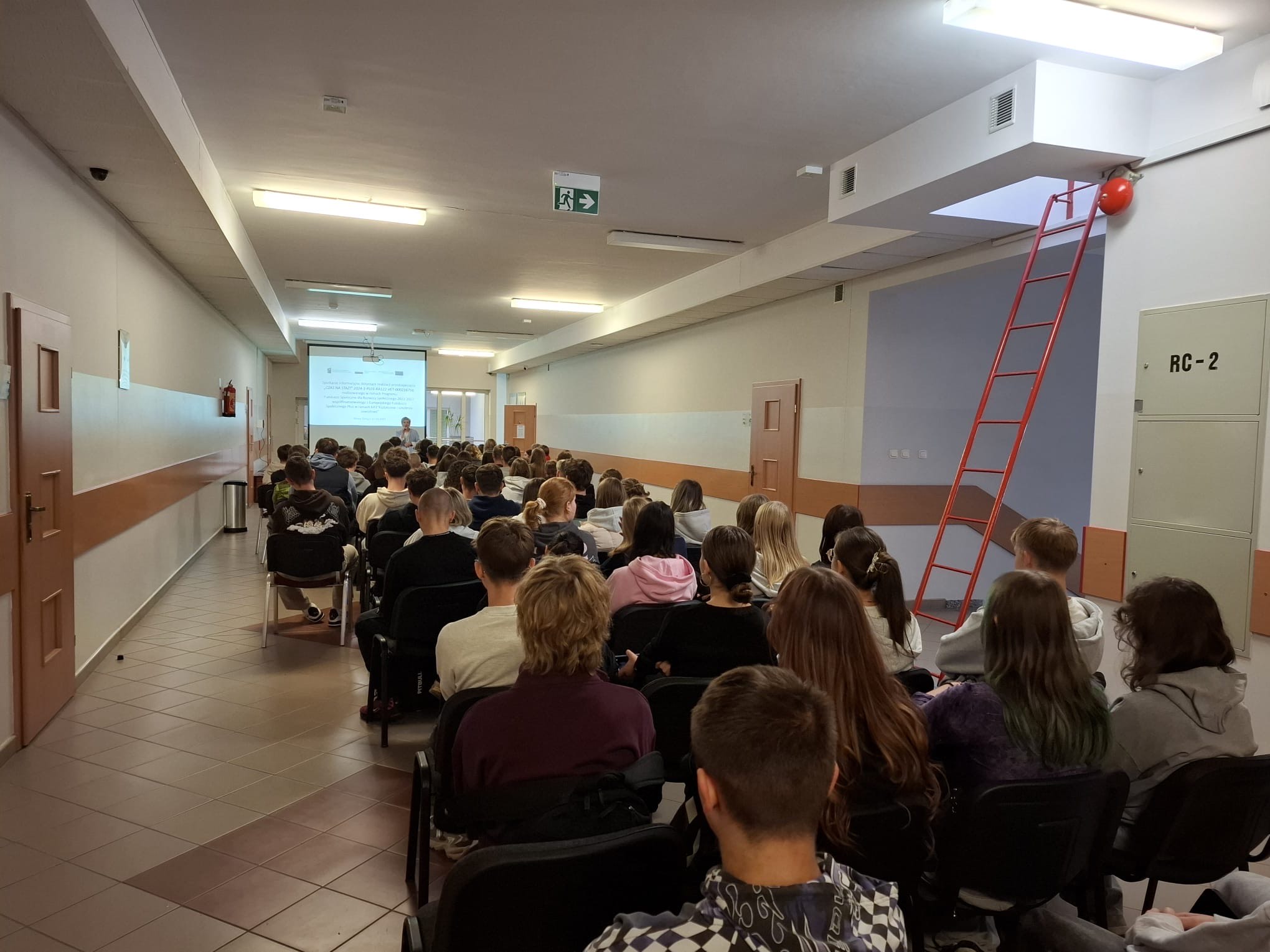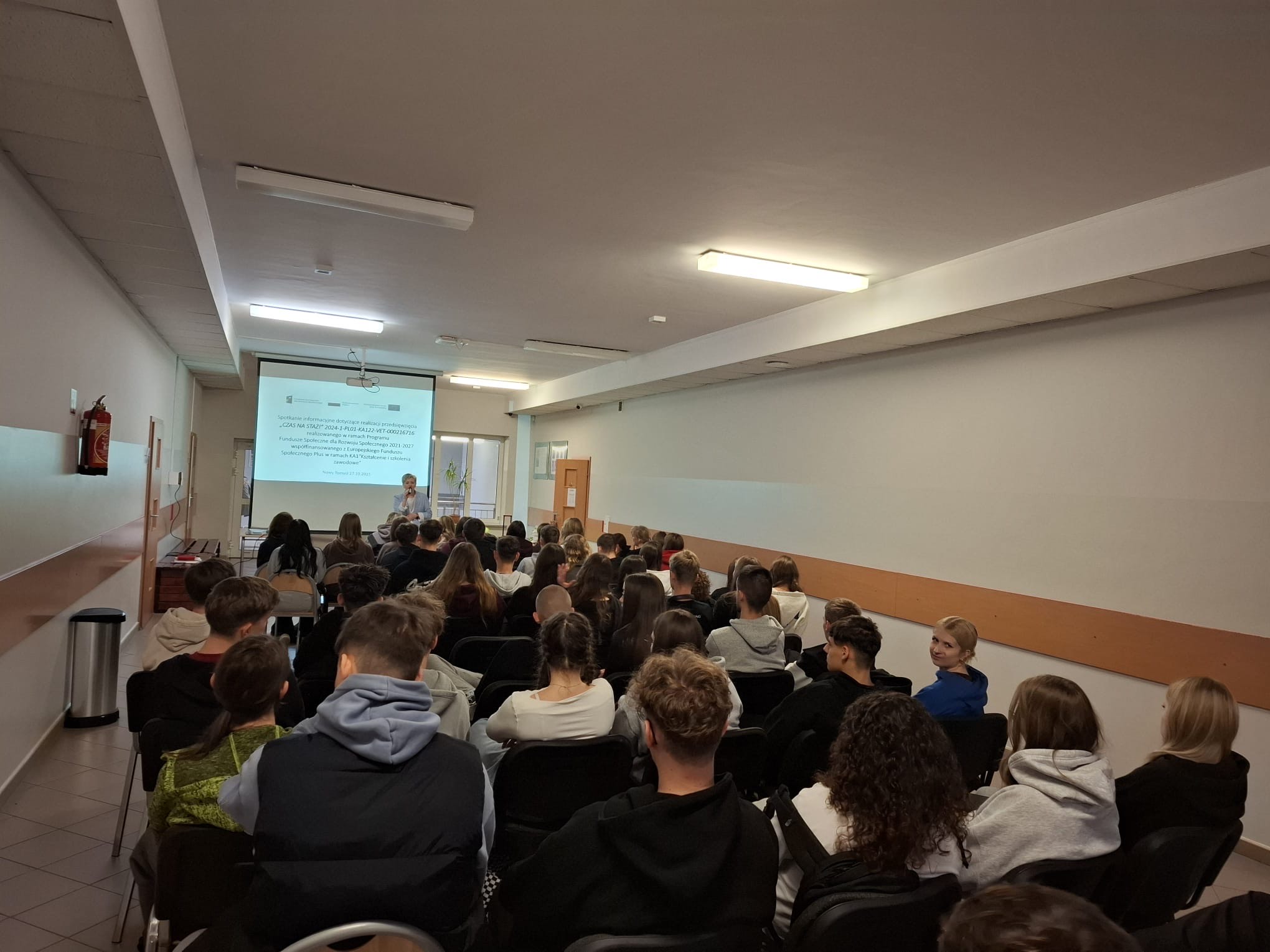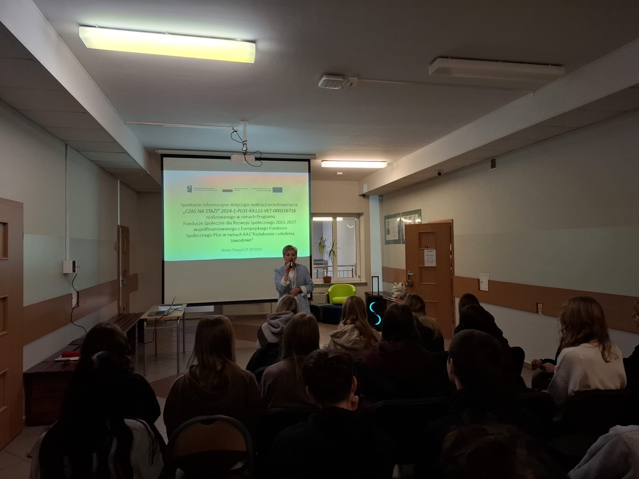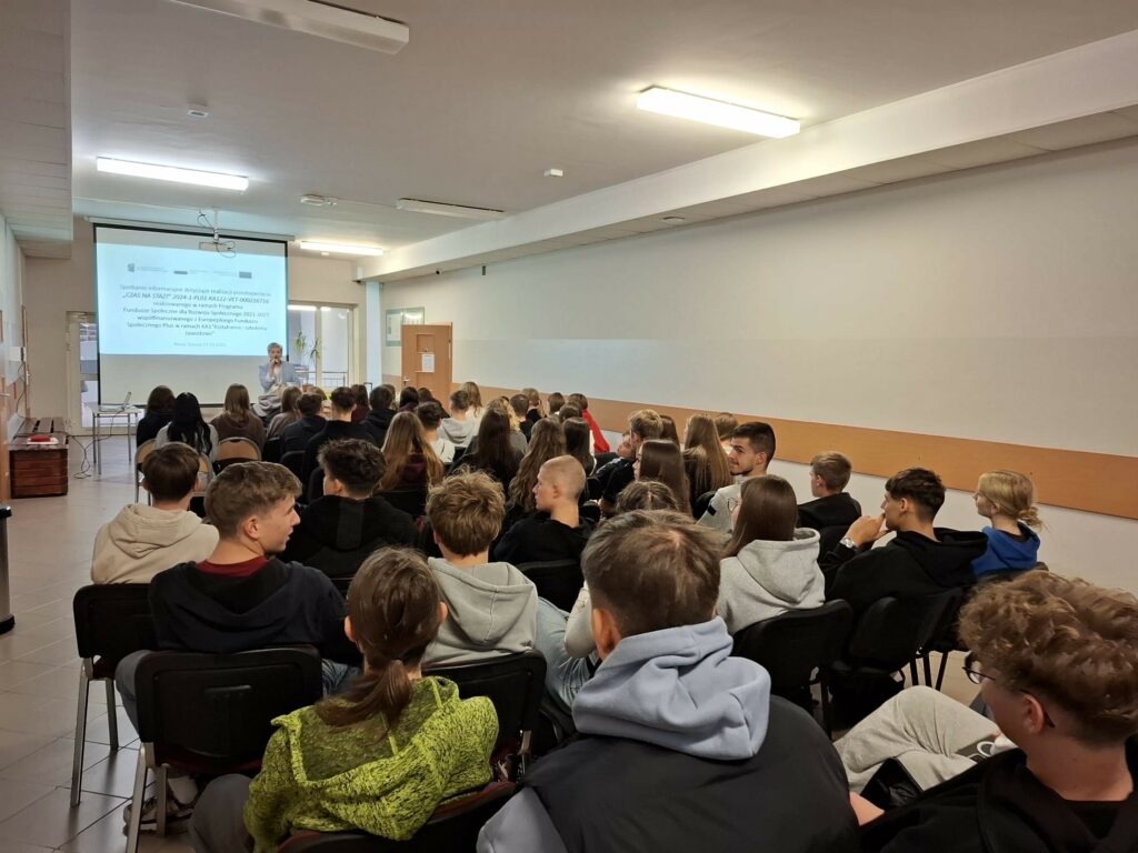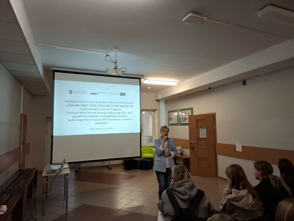 Dnia 27.10.2025 odbyło się spotkanie informacyjne w ramach przedsięwzięcia CZAS NA STAŻ! o numerze 2024-1-PL01-KA122-VET-000216716 realizowanym w ramach Programu Fundusze Społeczne dla Rozwoju Społecznego 2021-2027 współfinansowanego z Europejskiego Funduszu Społecznego Plus w ramach działania KA1 Kształcenie i szkolenia zawodowe. Na spotkaniu zostały przedstawione niezbędne informacje dotyczące etapu rekrutacji, przygotowania do udziału w przedsięwzięciu oraz wyjazdu i staży za granicą. Uczniowie aktywnie wzięli udział w spotkaniu i zadawali nurtujące ich pytania, na które otrzymali wyczerpujące odpowiedzi. Rodzice uczniów zainteresowanych udziałem w przedsięwzięciu otrzymali ulotki informacyjne z najważniejszymi informacjami dotyczącymi przedsięwzięcia realizowanego przez szkołę.